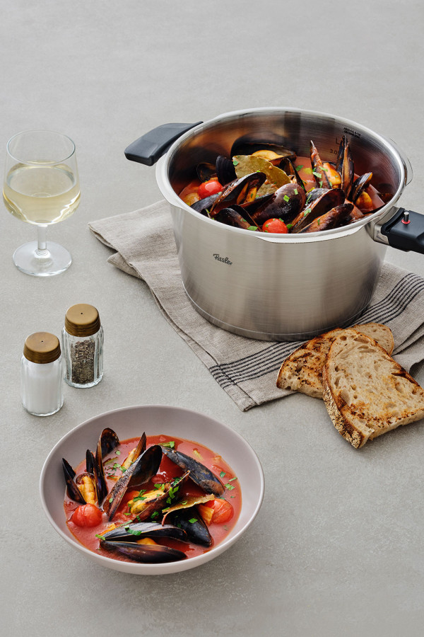 - 화이트와인을 넣고 한 김 날린 다음, 홍합, 토마토홀, 월계수잎을 넣고 뚜껑을 닫아 [압력계기 2단]으로 끓인다.