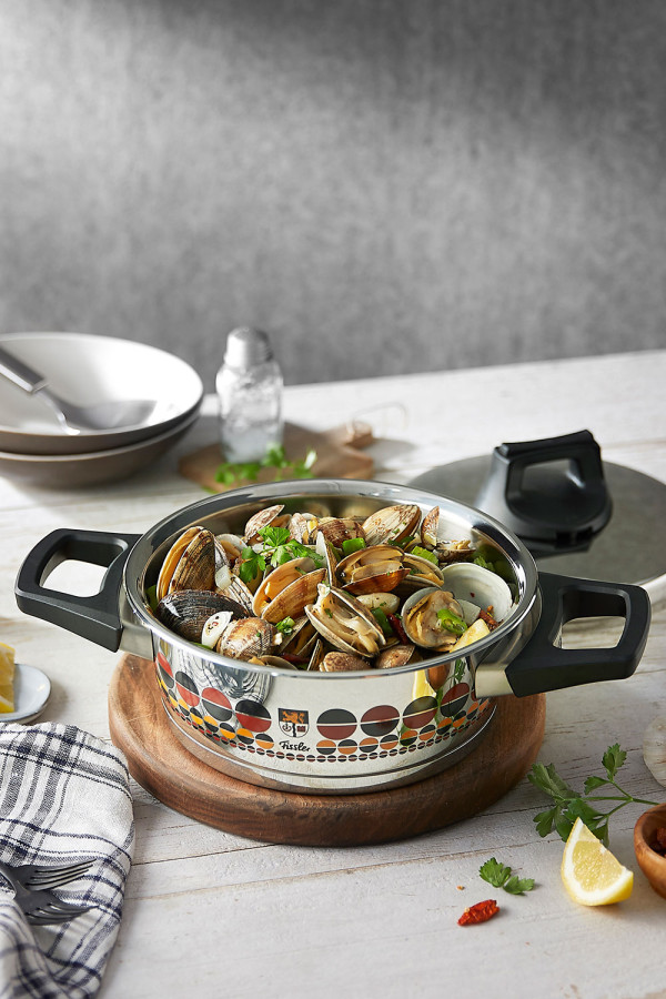 - 스튜팟에 기름을 두르고 인덕션 8단에서 예열한 다음 마늘, 양파, 샐러리, 대파, 소금 약간을 넣고 잠시 볶다가 바지락을 넣고 1-2분 볶아준다.