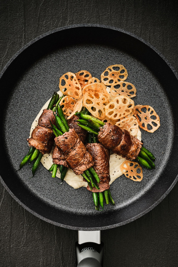 - 그린 빈스는 한 번 데쳐 찬물에 식힌 뒤 소금, 후추로 밑간을 한 등심에 5줄기씩 얹어 말아낸다.