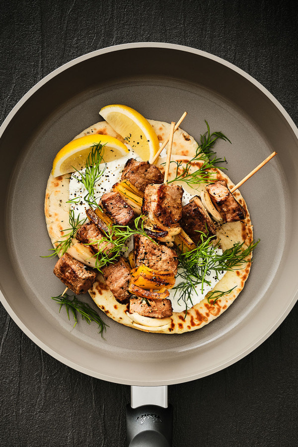 - 플랫 브레드에 꼬치구이와 짜지키 소스를 적당량 곁들이고 딜을 곁들여 완성한다.