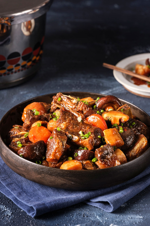 - 감자, 고구마, 당근, 표고버섯은 한입크기로 썰고, 갈비살과 함께 양념장에 30분간 재워둔다.
