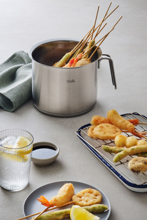 - 휘슬러 냄비에 카놀라유를 넣고 찹쌀 옷을 입은 더덕을 넣어준다.