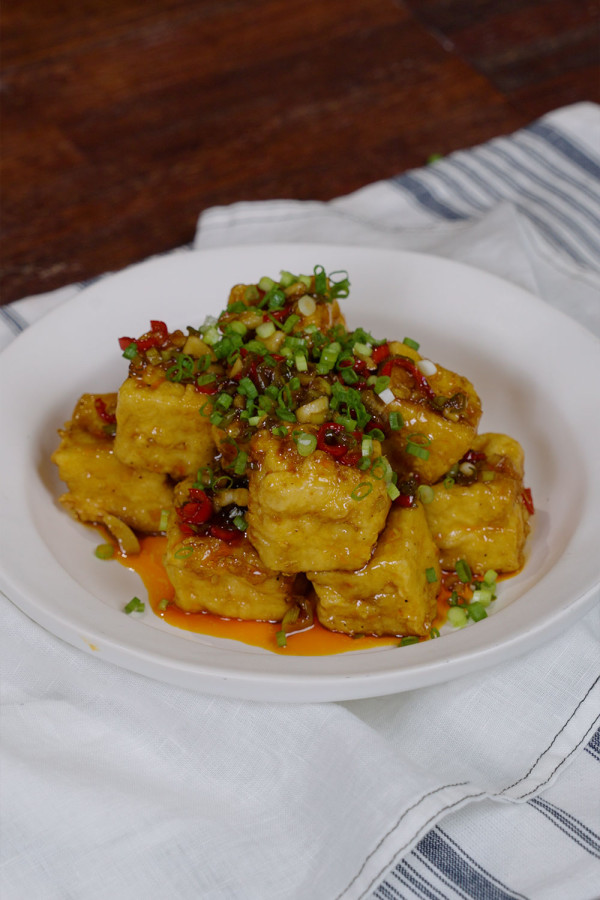 10. 두부 강정을 접시에 담고 마지막으로 송송 썬 쪽파를 올려 완성한다.