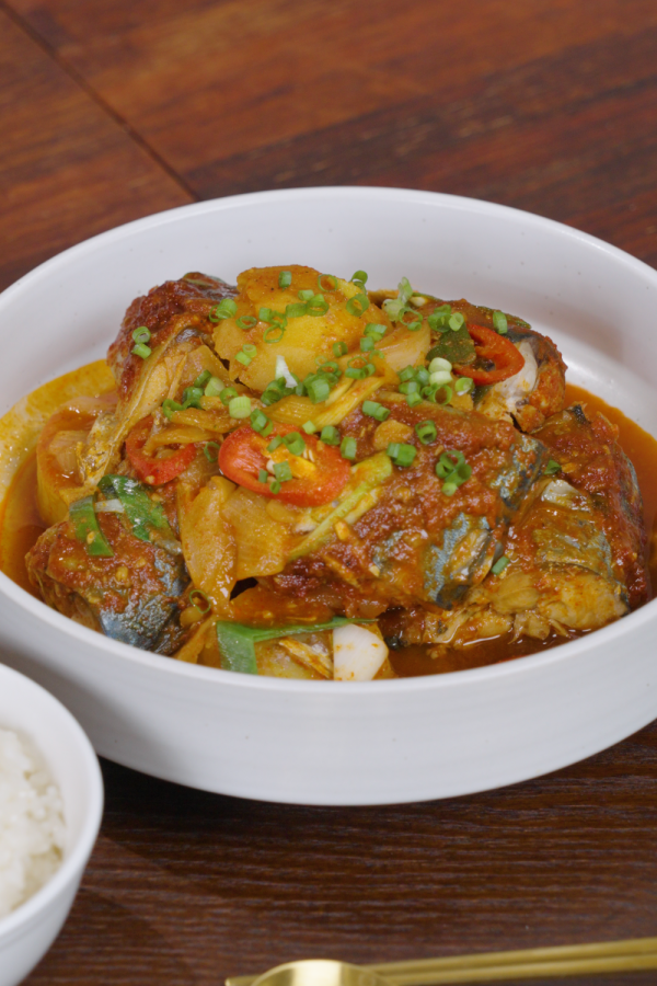 5. 압력솥에 육수, 무, 감자, 고등어, 양파, 양념장을 넣고 압력솥 뚜껑을 닫아준다.